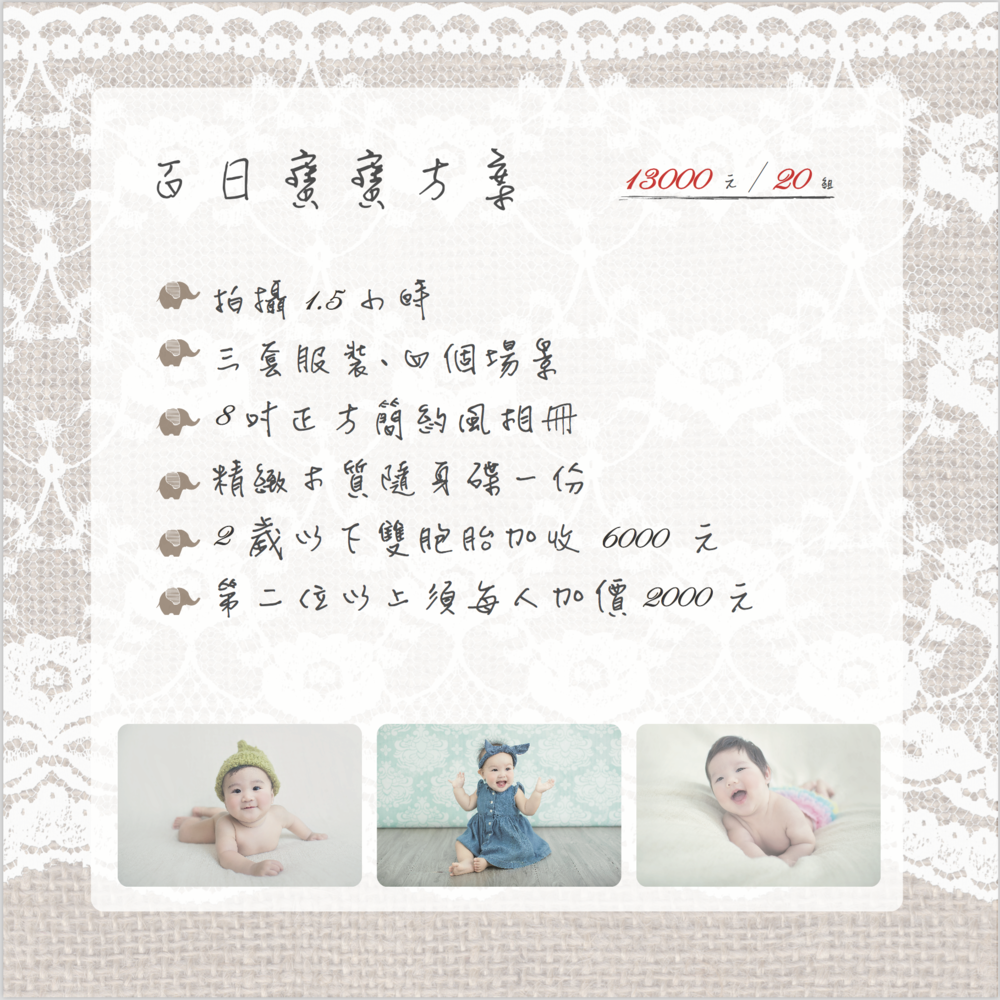 - 百日寶寶免費拍攝方案:這是我拍完之後才推出的超級優惠啊!不過比較像是試拍體驗,規範和報名方式請參考這裡。