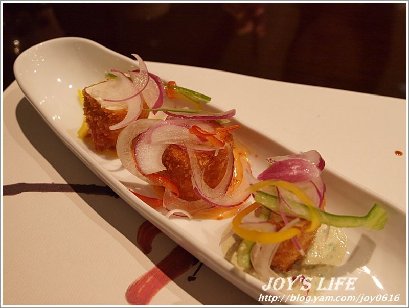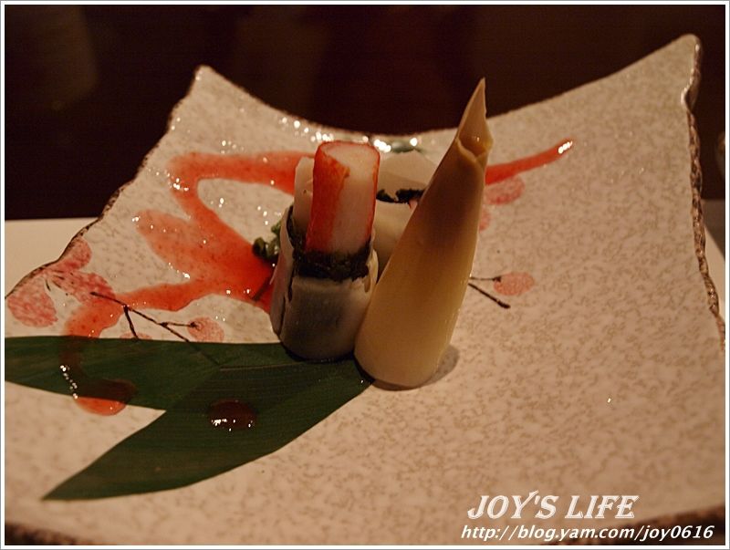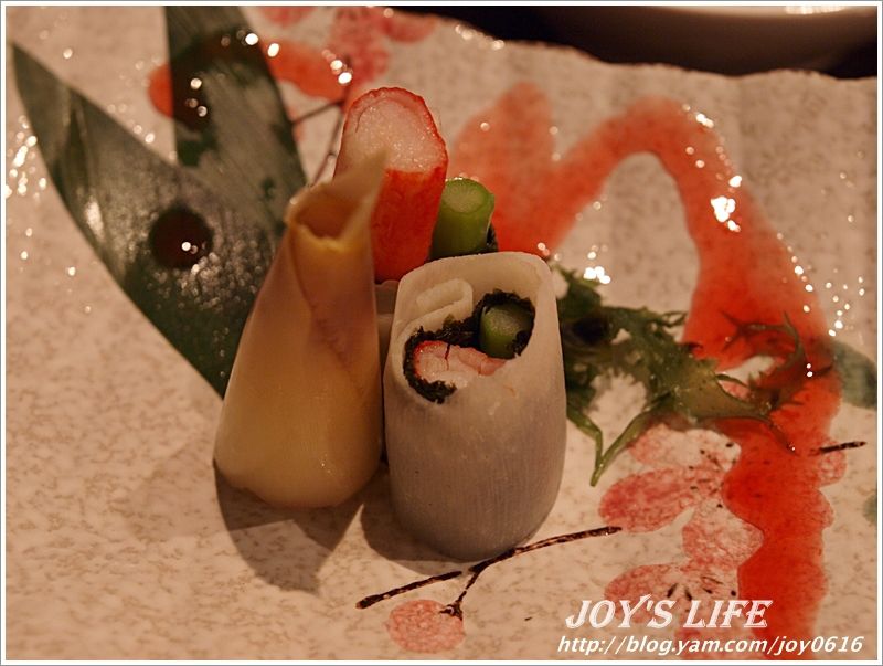 蘆筍 筍子 蟹肉棒 , 以紫菜捲起再用竹筍薄片捲起,輕輕淡淡 但是我覺得中間的紫菜太搶味, 有點突兀。