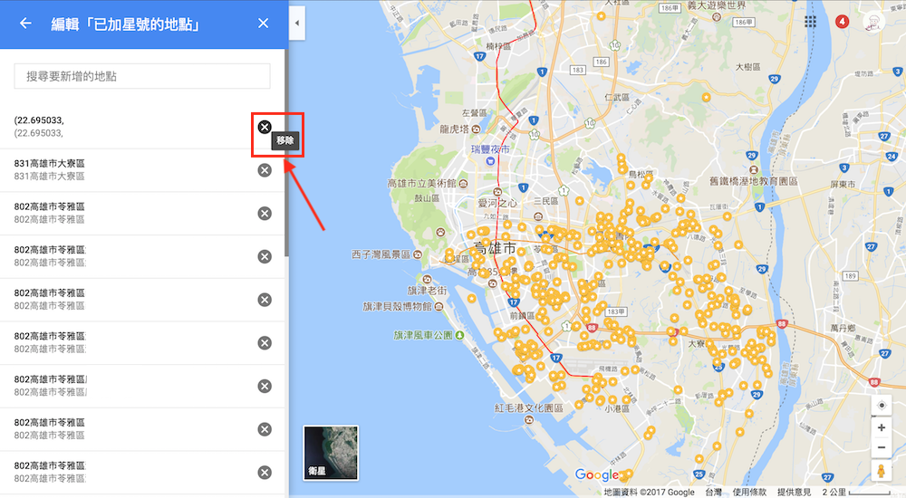 開啟你的地點後,請直接使用滑鼠點選「已儲存」選項,這時 Google 地圖就會列出所有先前已儲存的地點資訊,接下來只要找到欲刪除的地點,並點選右側的「X 移除」選項,就能將確定不會計畫前往,或已去過的地點資訊刪除,減少地圖頁面上的星號,讓頁面恢復乾淨。