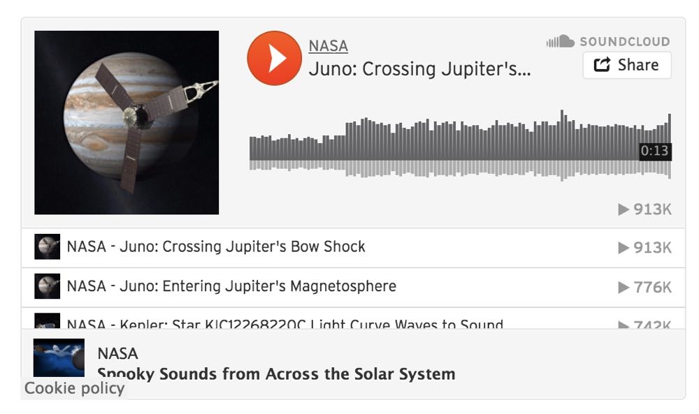這段神秘的音樂其實是 NASA 將太空梭在太空中搜集到的電波,透過技術轉換成聲波後所產生的,這張名為「Spooky Sounds From Across the Solar System」的專輯中共收錄了木星的咆哮聲、等離子波像是海浪般的聲音、土星的無線電波、木星的聲音等!