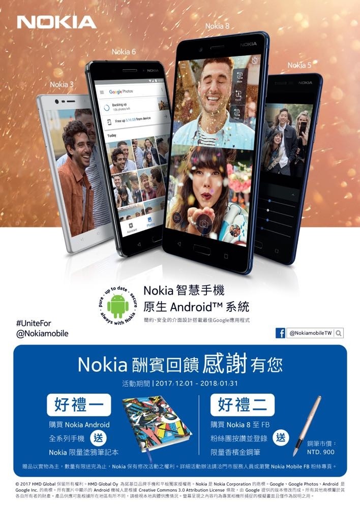 在過去一年 HMD Global 已經在台灣推出 4 款 Nokia Android 系列手機,包含自拍者專屬的 Nokia 3、簡約流線設計搭配HD高畫質螢幕的 Nokia 5、影音娛樂體驗的 Nokia 6 以及 9 月份才推出的首支旗艦機款 Nokia 8 更有著搭配前後蔡司光學認證鏡頭、Nokia OZO 360° 全景音效以及獨特一鍵雙拍功能。除了滿足消費者的拍照及影音功能,Nokia 全系列智慧手機更有市場上少見的「銅」色系列,受到許多消費者的詢問與喜愛,一推出即造成搶購風潮。HMD Global 台灣、香港及澳門地區總經理翟治豪表示:「台灣一直是 HMD Global 非常重視的市場,一路走來受到許多台灣粉絲們的熱情支持,為了能讓更多粉絲完整體驗 Nokia 全系列機型,我們特別規劃了一系列的活動來拉近與粉絲的距離,同時也能夠讓更多消費者可以一站式體驗 Nokia 智慧手機所帶來的絕佳感受。」