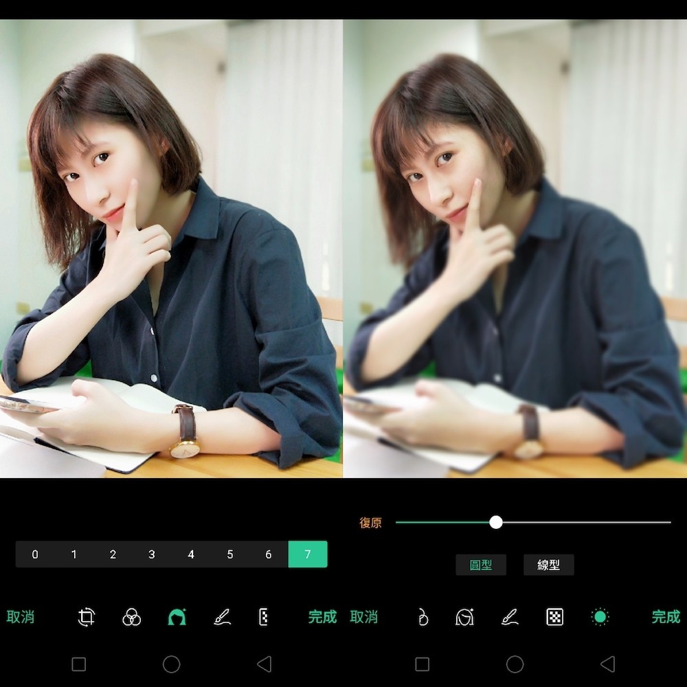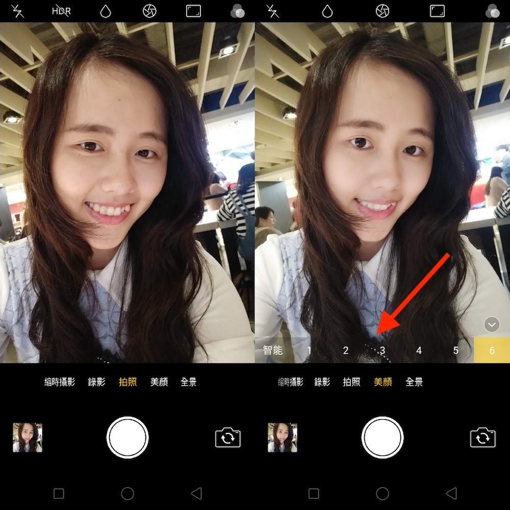 在 AI 智慧美顏自拍中,畫面底部會出現 6 段可自由選擇的美顏效果,以及不管選擇幾段,都會有的 AI 智慧美顏功能,雖說選擇 AI 智慧美顏後,手機就會利用 AI 智慧演算法,採集臉上 254 個特徵點,並從包括性別、年齡、膚質、膚色、表情等不同面向進行智慧分析,為每位用戶量身打造恰到好處的美顏自拍,但用戶還是可以依照自己的喜好進行手動選擇,調整出讓自己滿意的效果。