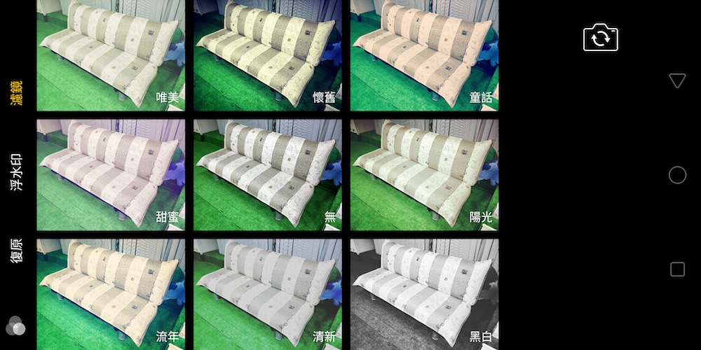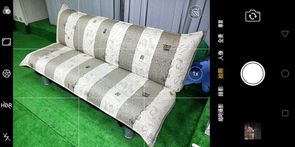 OPPO R11s 的相機介面同樣是將快門、縮時攝影、錄影、人像、全景、專業模式,以及前後鏡頭切換與相簿預覽放置在介面的右側,介面左側由上至下依序則是 9 種濾鏡、螢幕顯示方式、快門倒數、HDR 啓閉以及閃光燈啓閉。