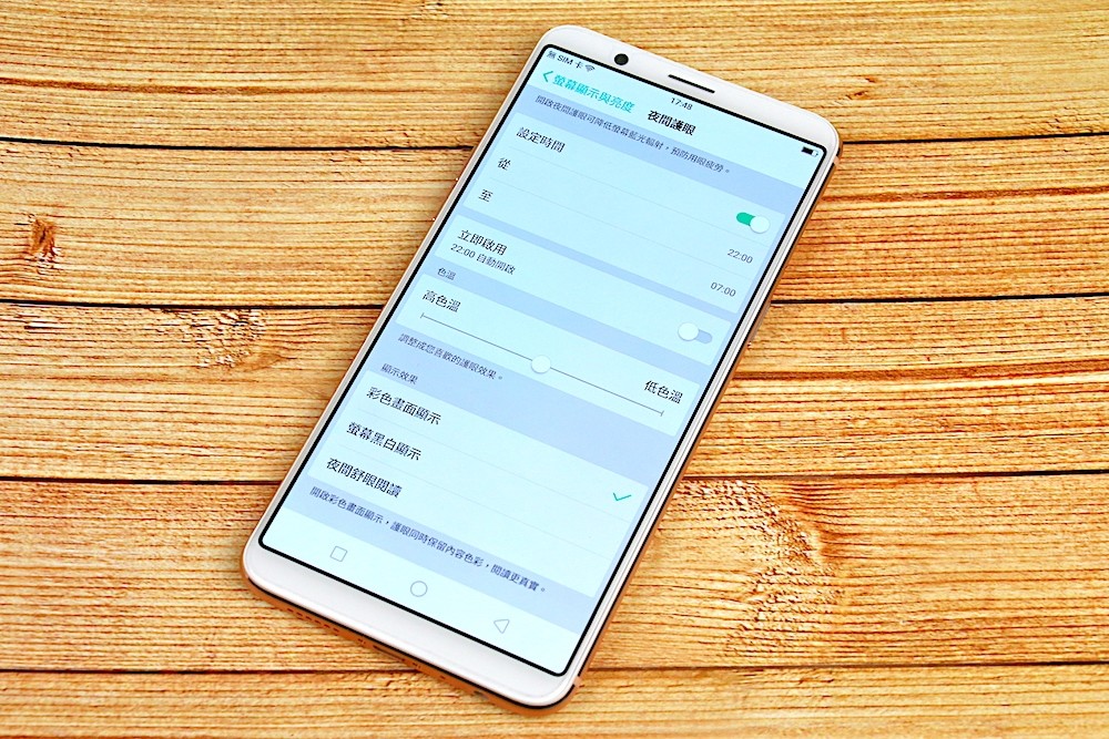 針對經常在 KTV、電影院、關燈後的房間…等昏暗環境中使用手機的用戶,ColorOS 3.2 貼心的內建「夜間護眼」功能,當用戶將此功能開啟後,除了可以自訂開啟與關閉時間、螢幕色溫之外,還可以將螢幕設定為黑白顯示或夜間舒眼閱讀,讓用戶能在昏暗環境中舒適的觀看手機。