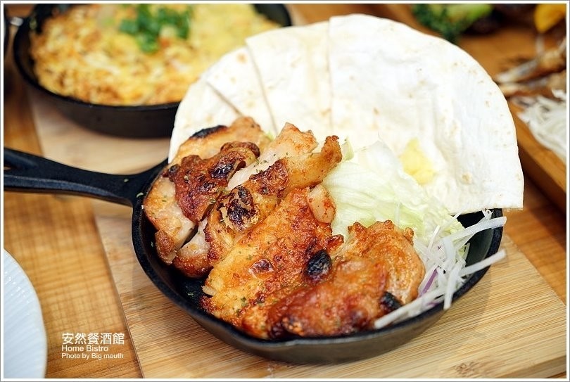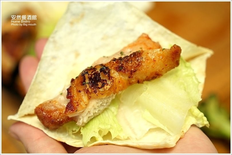 ▼紐澳良雞腿排(附餅皮),醃漬過的紐澳良去骨雞腿排搭配生菜、餅皮,看起來也是一道創意料理!