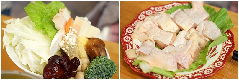▼ 菜盤裡頭有不少當季時蔬, 完全沒有人工的火鍋料, 感覺相當新鮮又健康! 雞腿肉也給得相當大器, 而且都已經去骨處理, 直接丟下鍋涮煮即可!