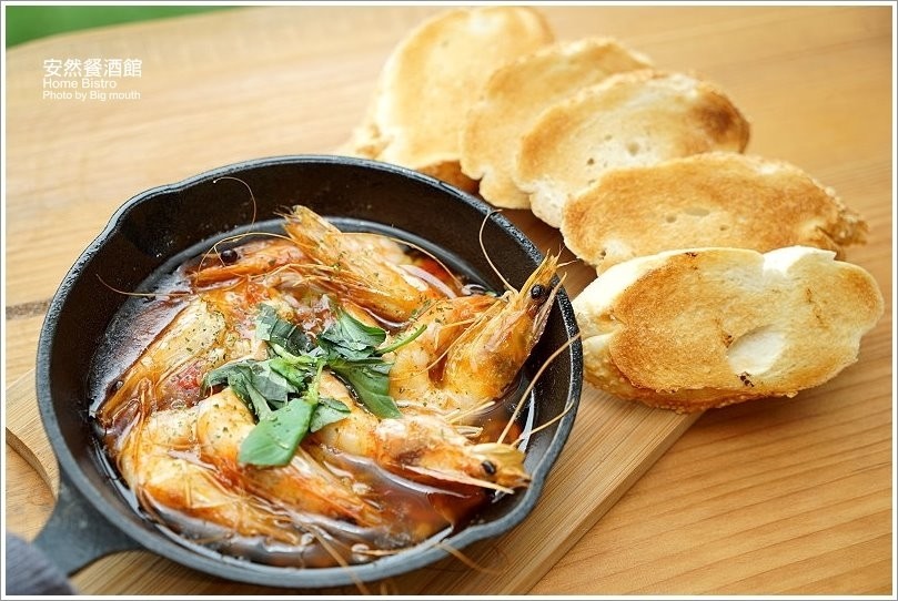 ▼橄欖油蒜味蝦,一旁搭配香烤過的法式麵包,不管單吃或是搭配麵包享用都沒問題!