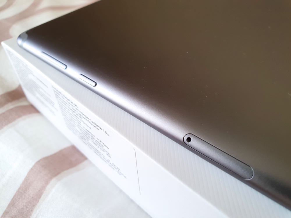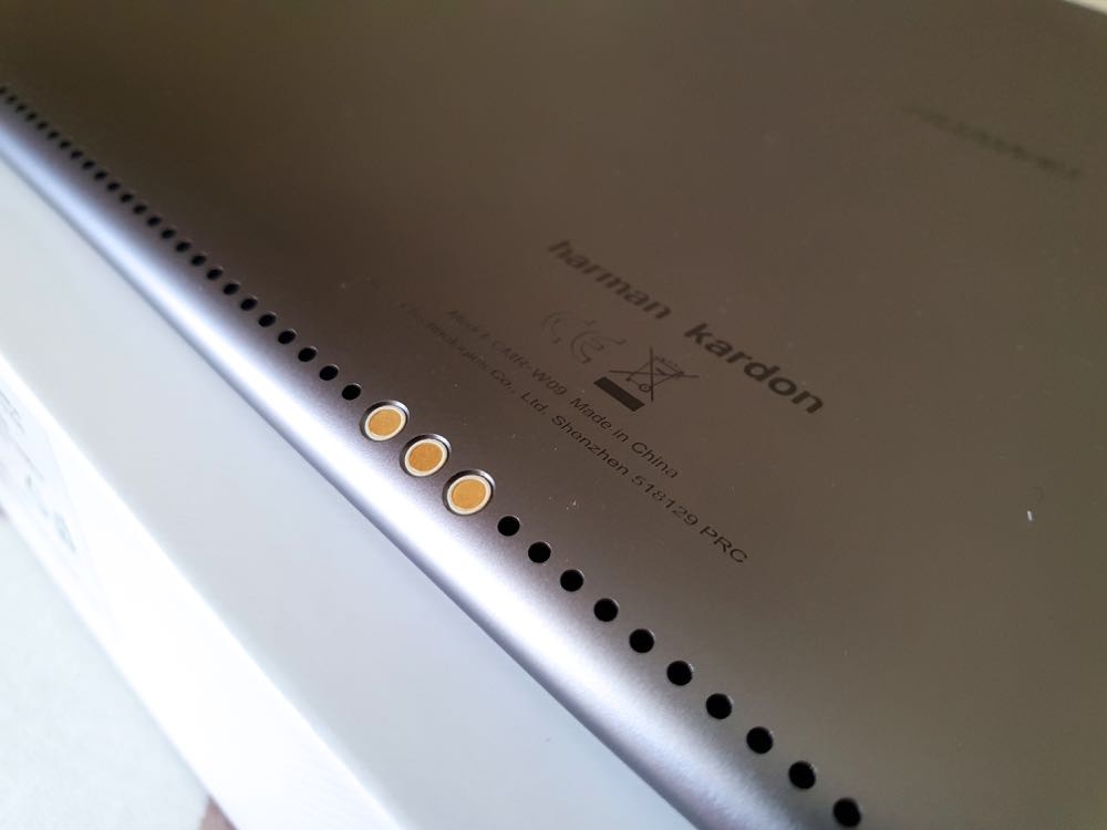 至於 10.8 吋 Wi-Fi 版的外型就與 8.4 吋 LTE 版有著明顯的不同設計主題。以橫向為主的設計,首先可以看到背後那三個準備用來擴接鍵盤、保護套等周邊的金屬點,以及上下兩側共 4 個揚聲器的豪邁設計。