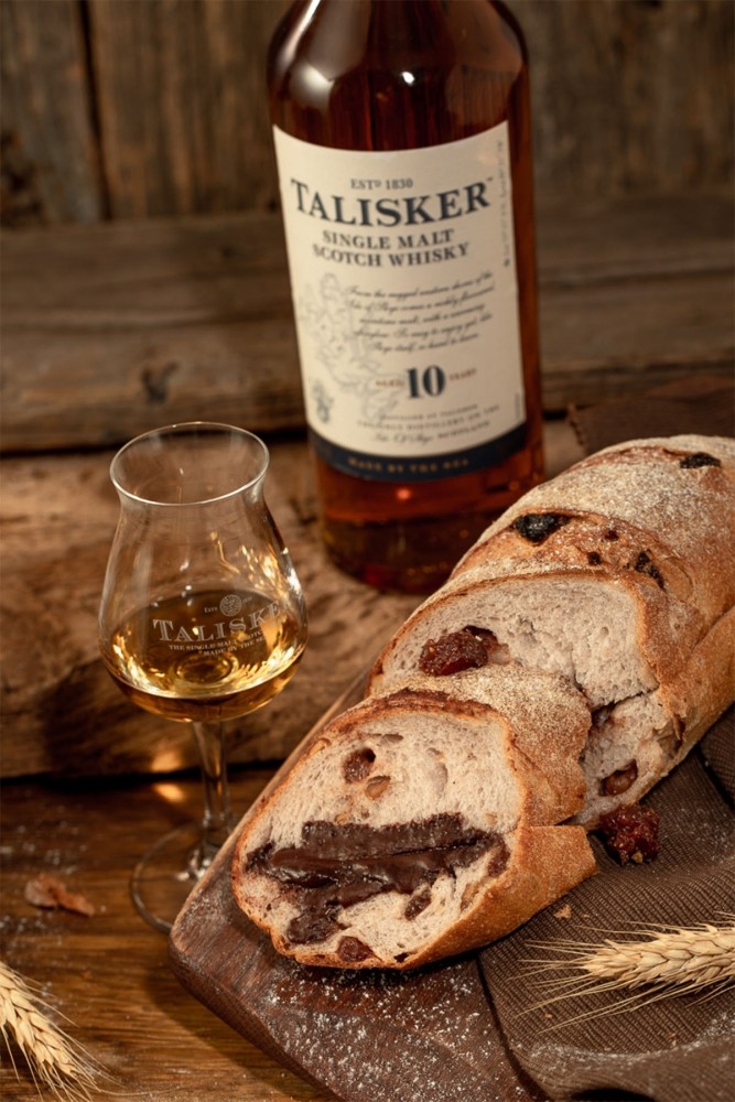 Talisker泰斯卡10年具有鮮明的海鹽香氣,並以全球唯一不對稱蒸餾器進行蒸餾,憑藉著如此獨特的製酒工藝,陳釀出獨一無二的細緻優雅品味,也造就泰斯卡威士忌成為全球獲獎最多的單一麥芽威士忌品牌之一。富有淡雅乾果香的威士忌與歐式麵包的香味十分契合,咀嚼時也能帶出威士忌獨有的木質氣調。