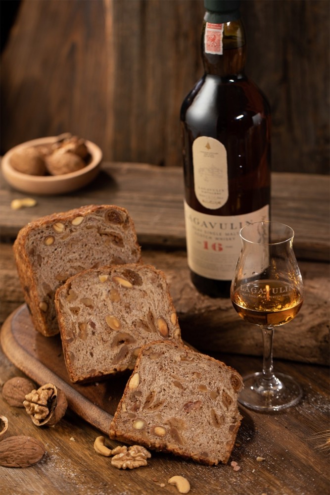 強調長時間慢速蒸餾的Lagavulin 16年,是一款壯麗、強勁、層次豐富的酒款,具有鮮明的泥煤、煙燻以及馥郁乾果甜味,以Lagavulin威士忌酒漬土耳其無花果乾,使用真空技術處理,將Lagavulin優雅細緻的泥煤氣息融入無花果中,搭配香脆的杏仁果與核桃,一起揉入裸麥麵糰中,出爐之後趁熱再刷上一層厚厚的威士忌,讓濃郁的酒香包覆扎實的裸麥麵包。此款麵包採用較為粗曠的外型,核桃及杏仁果帶來的豐富口感也與Lagavulin酒香的層次相互呼應,除了切成薄片食用外,在麵包抹上薄薄的奶油也非常美味。