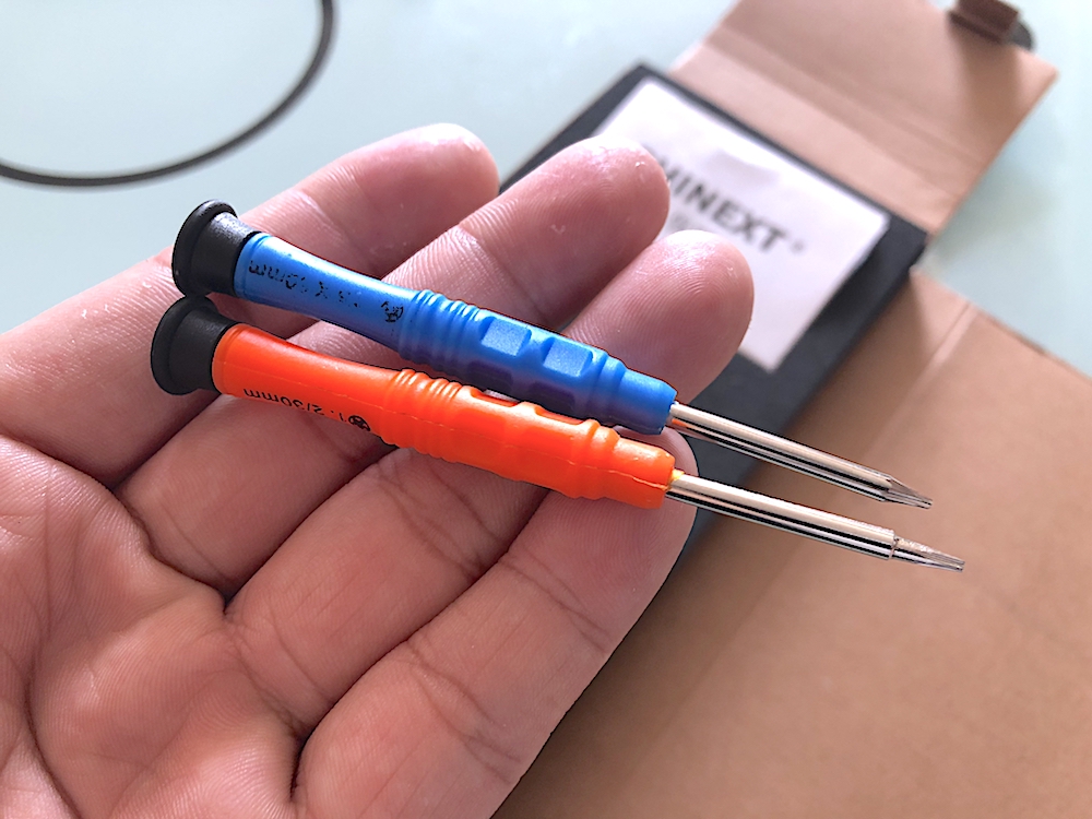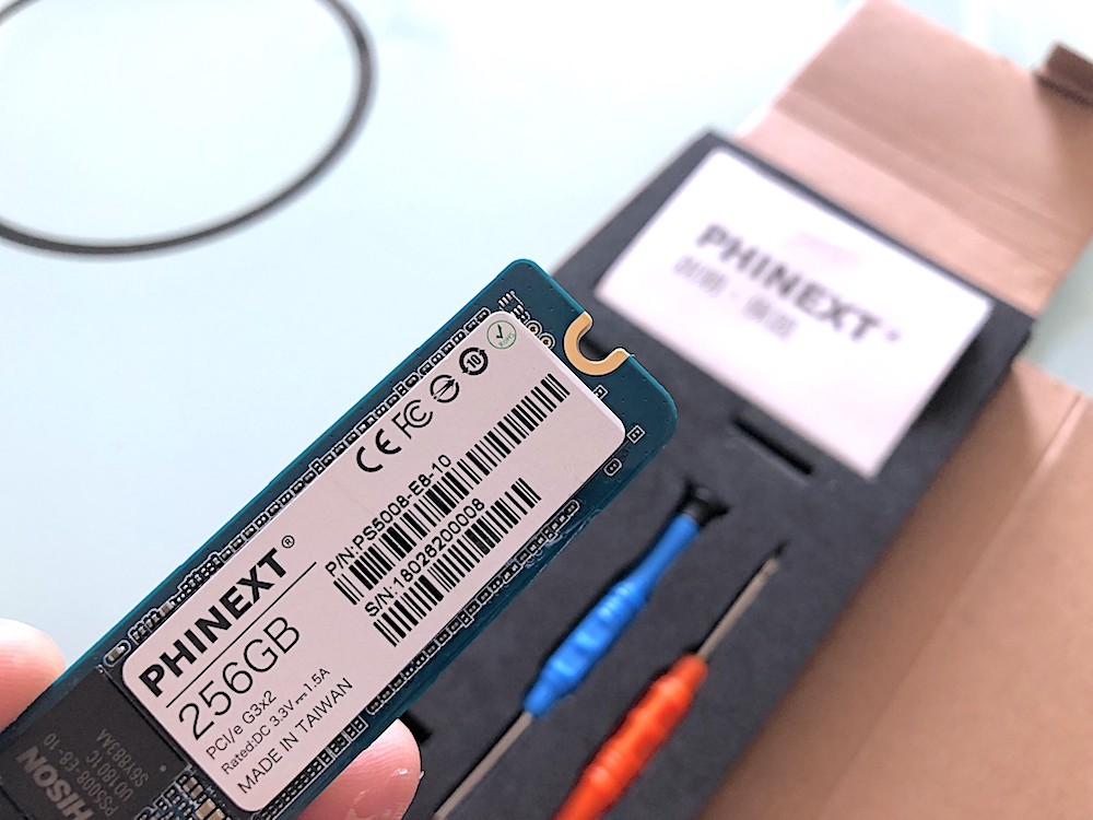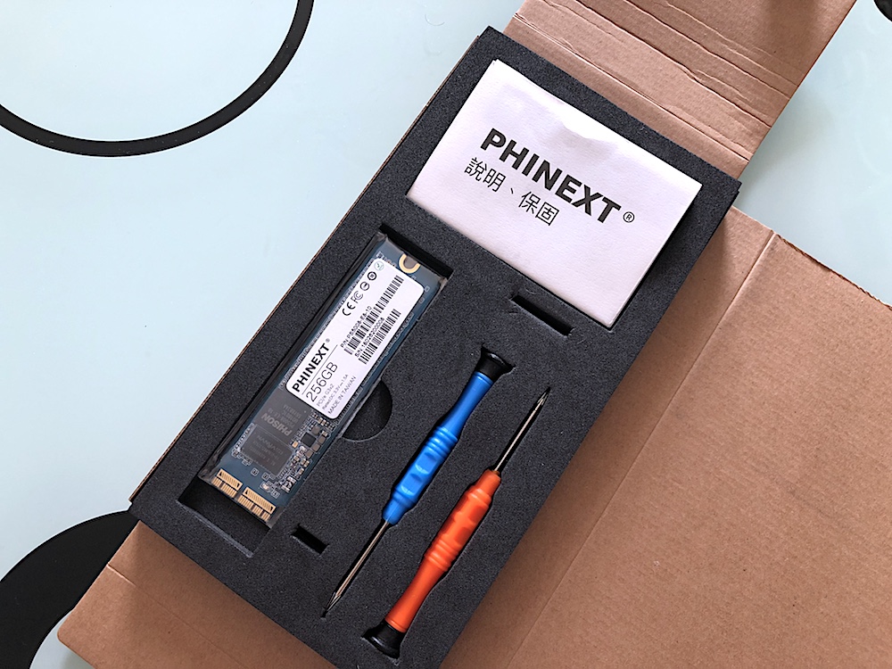 打開外盒後,除了可以看到 256GB 的 PHINEXT 蘋果加速器本體外,還可以看到使用說明以及兩把專門用來拆卸 MacBook Pro 底板與內建 SSD 的星型螺絲起子。