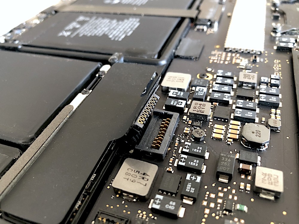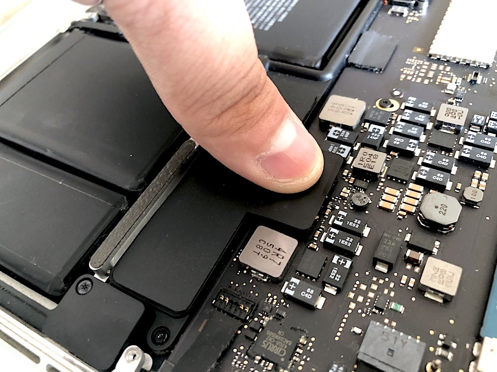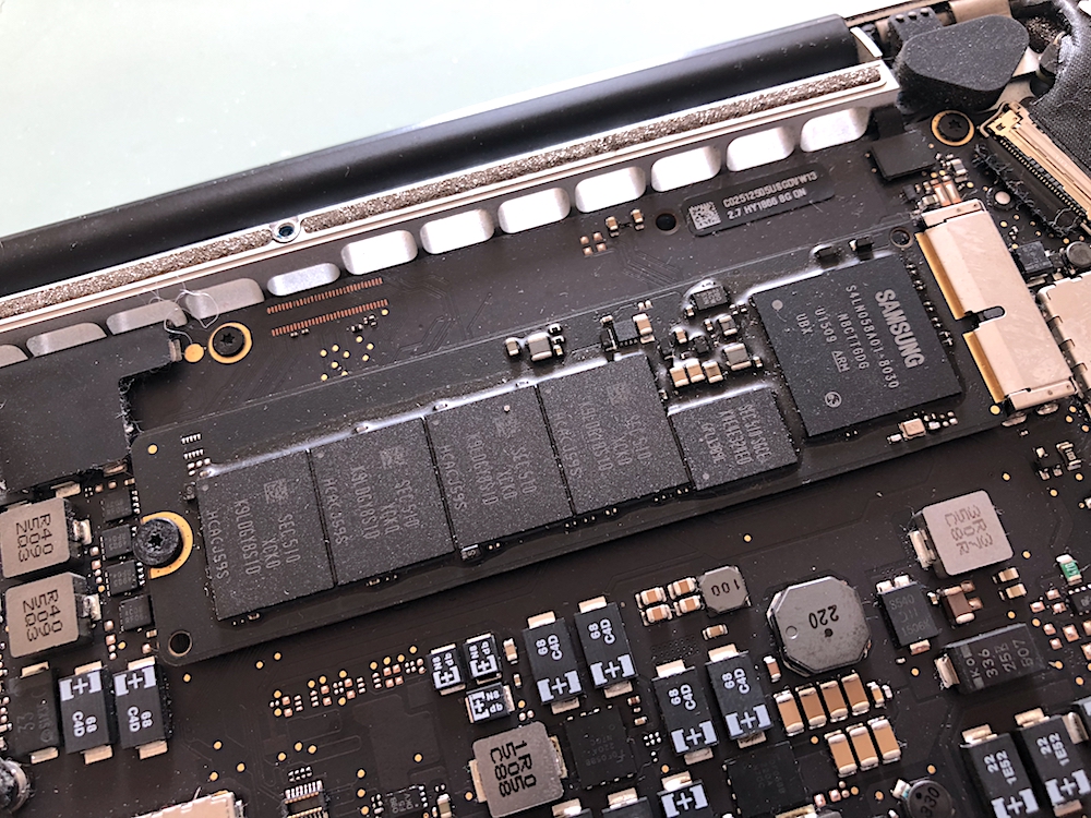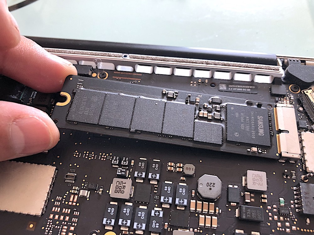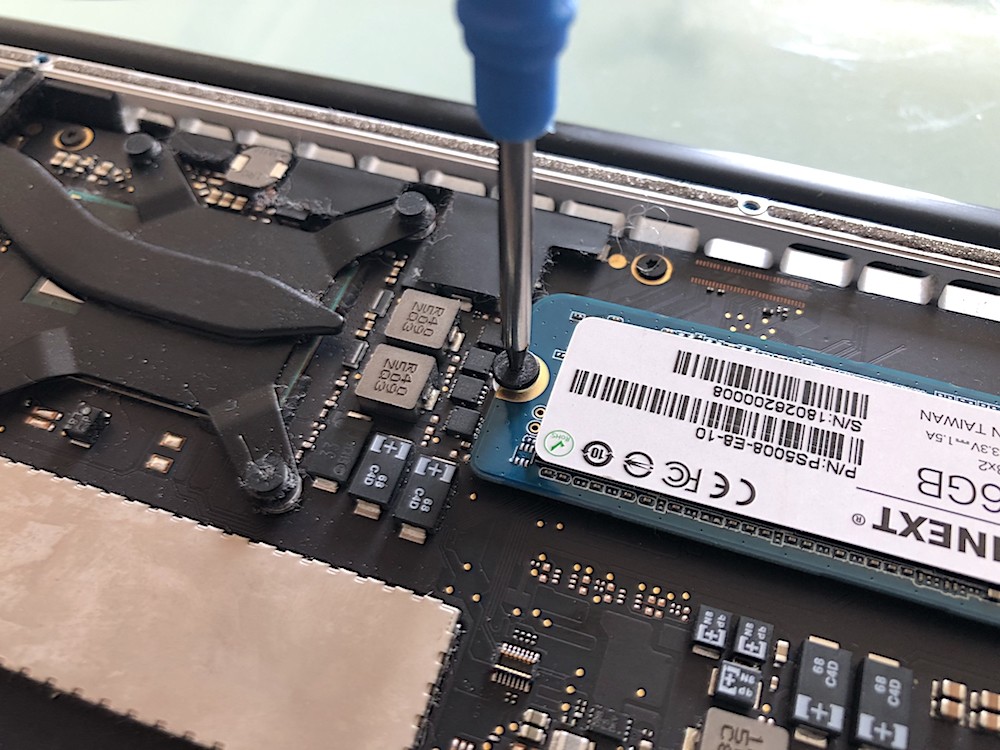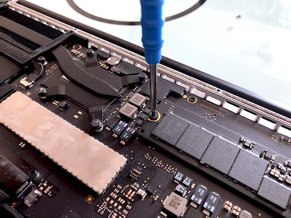 MacBook Pro 13 吋的 SSD 位於主機板右上方,後方有一個固定用的星型螺絲,拆裝前請先使用藍色星型螺絲起子將螺絲卸下。