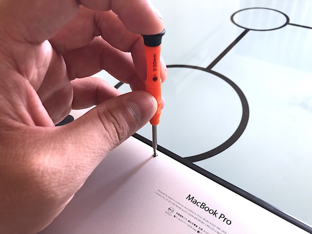 介紹完盒裝內容物後,接下來要教大家如何自行更換 MacBook Pro 的 SSD。在開始拆卸底板的十顆螺絲前,請先將 MacBook Pro 關機,接著拿出盒裝內附贈的橘色星型螺絲起子,從任一角落順時針或逆時針依序卸下螺絲。