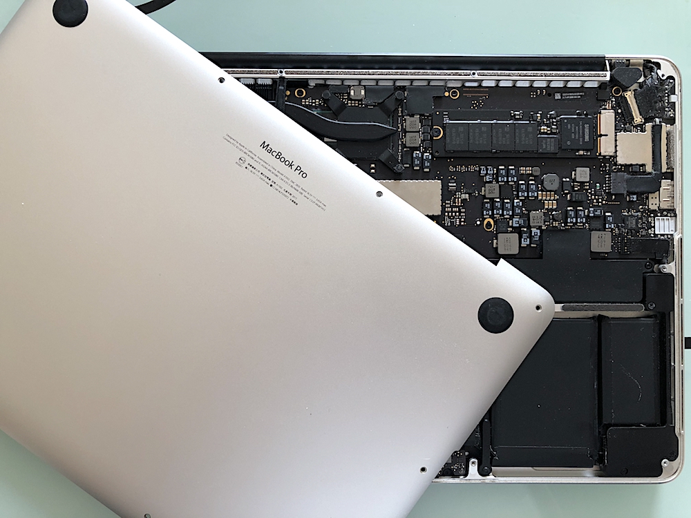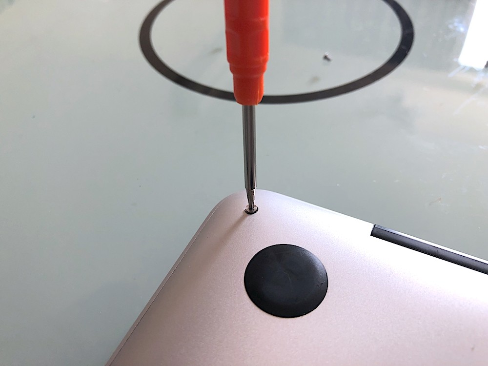 要特別注意的是,MacBook Pro 底板的螺絲非常小又容易滑 / 崩牙,且在市面上也非常難買到,建議拆卸時力道不要太大,而卸下的螺絲也可以像圖片一樣,將它們依照原本的位置排好,這麼做除了可以避免遺失外,組裝時也能讓它們回到原本的位置。
