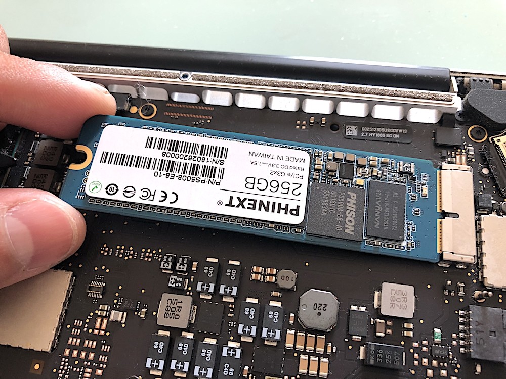 將 MacBook Pro 內建的 SSD 拆除後,接下來要進行 PHINEXT 蘋果加速器的安裝作業。安裝方式非常簡單,首先必須對準 SSD 與底座的防呆凹槽、金手指位置,並慢慢的向前推進,待金手指完全固定於底座後即可。