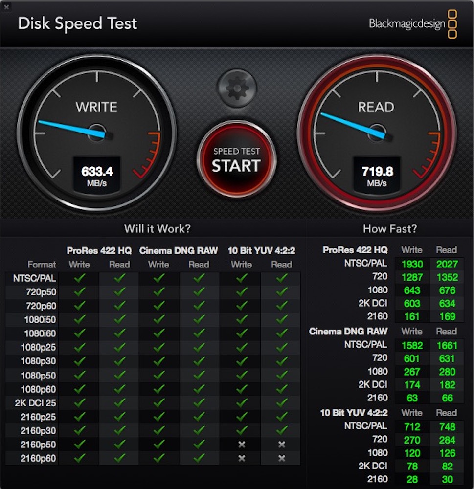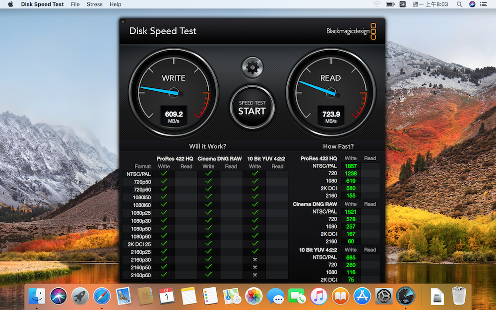而 AJA System Test Lite 所測出的讀寫成績,與 Disk Speed Test 大致相同,寫入成績為 630 MB / s,而讀取成績則是落在 719 MB / s,讀寫速度甚至超越原廠內建的 SSD,大幅加快了檔案的讀寫時間,讓原本讀寫速度較慢的老舊 MacBook Pro 2013,有了更快速且順暢的反應(速度會因系統效能有所不同)