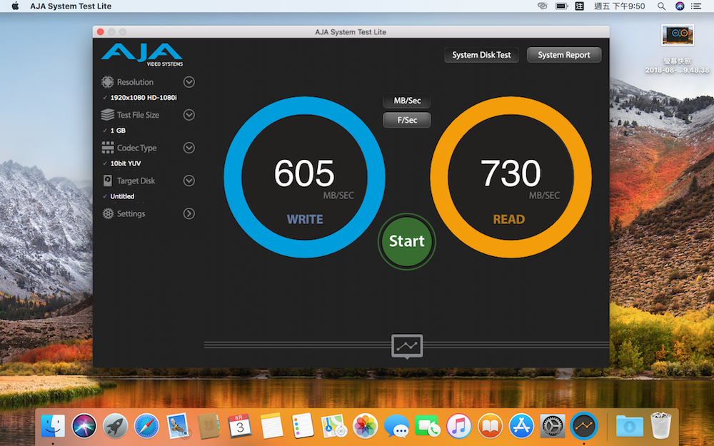 AJA System Test Lite 所測出的速度與 Disk Speed Test 大致相同,寫入速度落在 605 MB/s,讀取速度則是落在 730 MB/s。整體來說 PHINEXT 蘋果加速器的讀寫速度表現相當不錯,讀寫速度與 MacBook Pro 原廠內建的 SSD 不相上下,且軟體的安裝、開啟速度也非常快速,對於不想等太久的使用者來說,PHINEXT 蘋果加速器的確能給予相當快速的反應。(速度會因系統效能有所不同)