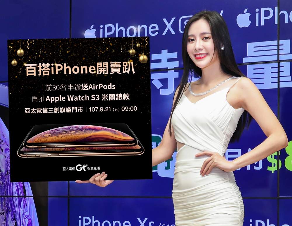 亞太電信宣布將於 9/21(五)上午9時於Gt智慧生活三創旗艦門市,針對iPhone Xs、iPhone Xs Max開賣,舉辦「百搭iPhone開賣趴」,現場規畫數百項好禮,包括價值24,900元 的Apple Watch 3米蘭式錶環 1只 (42公釐)、上百個百元現金獎、咖啡兌換券及多樣精美禮品,歡迎民眾現場同慶。另外,「開賣趴」現場凡新申辦、攜碼或續約用戶成功申辦最新iPhone的前30位幸運兒,再加送市價5,490元的AirPods乙台〈資格依現場發送號碼牌為準,發完為止〉,還可加抽Apple Watch 3米蘭式錶環 1只(42公釐) 等多樣好禮,歡迎消費者踴躍到場同樂。