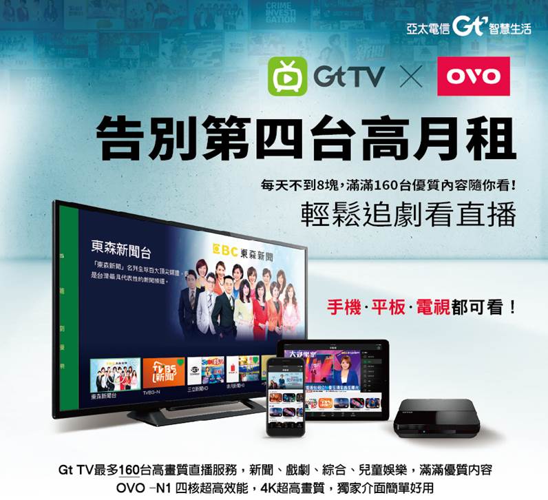 亞太電信結合鴻海科技集團的力量與資源,全力發展數位匯流服務,除了不斷增加Gt TV直播頻道,更跨入家戶市場,讓民眾在家即可透過智能電視使用Gt TV,同時亞太電信也照顧到沒有智能電視的用戶,推出Gt TV+OVO N1機上盒影視包,在家輕鬆享受影音生活,未來將持續推出多元貼心方案,在消費者還沒想到前,亞太電信早就準備好,並請拭目以待。