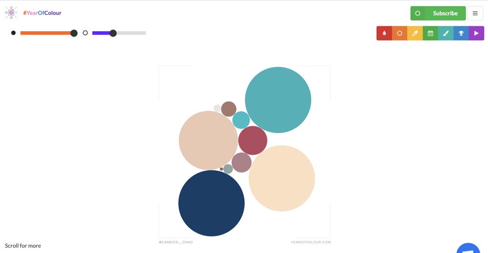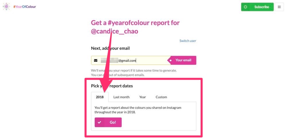 只要登入「YearOfColor」後確定自己的 Instagram 帳號,底下有著 「2018」、「Last month」、「Year」、「Custom」四個時間區間選項,選擇「2018」就能看見自己去年的 IG 顏色。