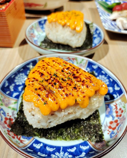 ▼海膽醬烤飯糰,上頭塗了一層厚厚的海膽醬再炙燒而成,光看就叫人滿意!