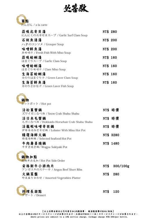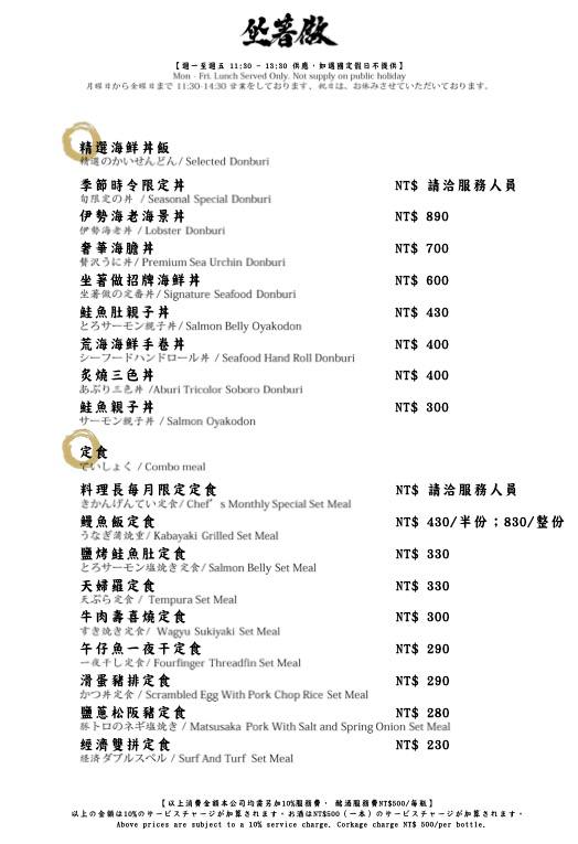 ▼坐著做日本料理菜單厚厚一本,平日中午有提供8種海鮮丼飯及9種午間定食,想要其他單點也沒問題,熱門的無菜單料理每天都有提供,價位有1180元、1780元、2380元不等,也可以提出預算依照個人喜好來客製餐點!(詳細菜單置於文末)