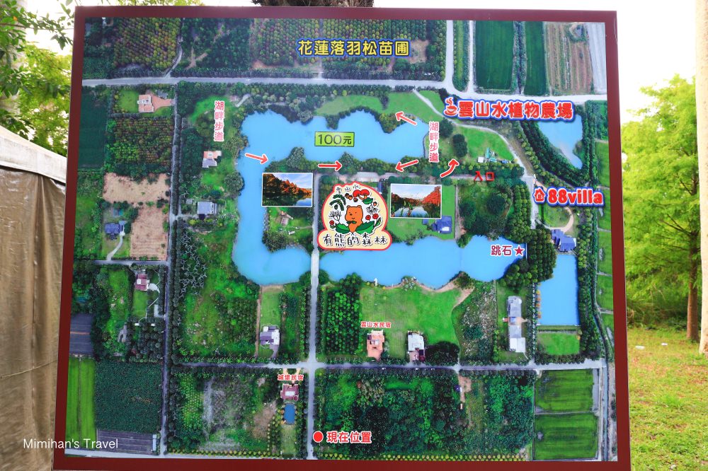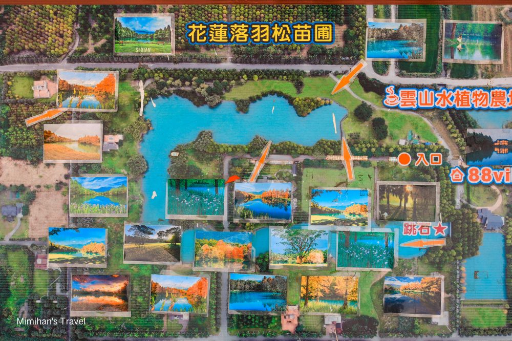 這次再訪雲山水,發現入口處多做了空拍圖,把完整的雲山水夢幻湖地圖呈現給大家。整個雲山水園區就是圍繞在湖水四周,裡面有好幾家民宿、咖啡店。目前只有最北邊的雲山水植物農場需要100元門票,可以折抵50元消費,而落羽松瀑布(跳石)那邊是可以免費進入的區域。