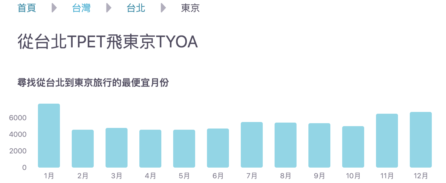 從skyscanner的年度圖表看,東京機票便宜的區間就是$5,000~$6,000,東京淡旺季很明顯,賞櫻、賞楓、暑假、聖誕節期間都非常的貴,一般國內航空大約可以買到9,000-12,000,特別節日約15,000上下,買到$6,000內機票都算非常便宜唷!