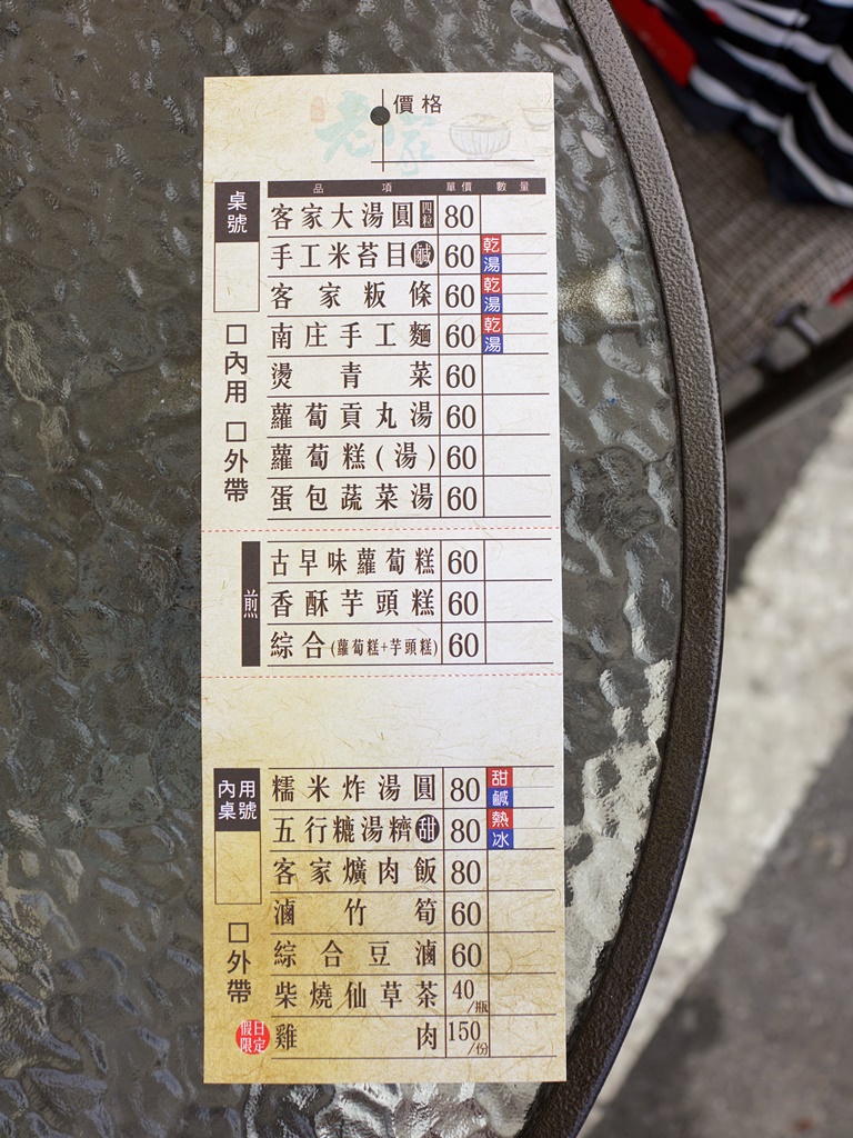 餐點部分有客家大湯圓、手工米苔目、南庄手工麵、客家粄條、蘿蔔糕,還有炸湯圓、熝湯齊(又稱牛汶水)等,價格幾乎都是60元或80元,感覺是為了方便算錢?我覺得對於人力不足的店家來說是蠻聰明的作法。