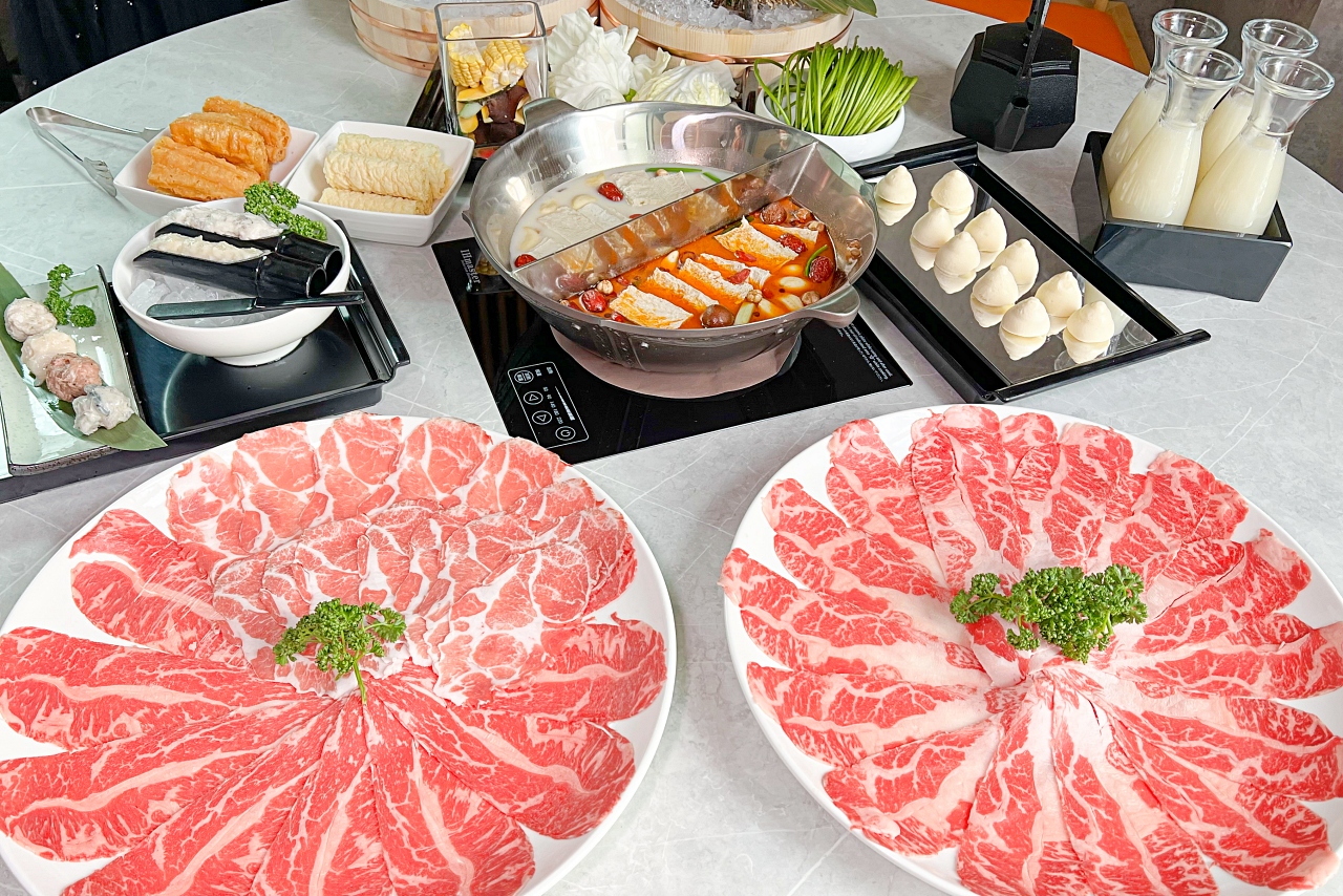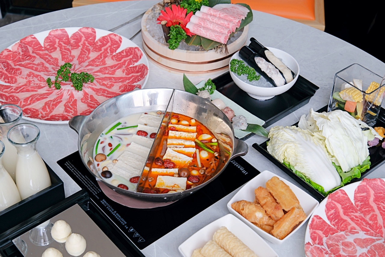 【無老鍋 信義店】有別於其他無老鍋的裝潢,是以中西合併的輕奢時尚打造,空間裡充滿了古銅金線條與亮色系點綴,大理石打造手搖飲吧檯特別吸睛;菜單加入年輕人很愛的創意手搖飲,把吃鍋跟手搖飲結合,邊吃熱呼呼火鍋邊喝透心涼手搖飲,簡直絕配啊;信義店還有獨家日本A5和牛、古早味甜點流沙白糖粿,再加上經典冰淇淋豆腐、無限續點的鴨血和麵包豆腐,超過癮。