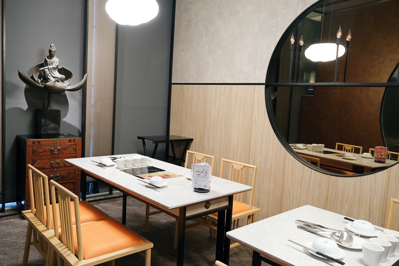 無老鍋信義店把品牌的禪風精神加入時尚元素,古銅金流線、亮色系木質與皮革、造型吊燈、榻榻米妝點、大理石吧台、質感鐵件…把無老鍋給年輕化了!友人一踏進門就說:「這就是年輕人愛的無老鍋啊! 」可見我們對這間新型態的無老鍋有多喜愛。