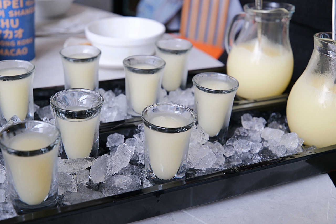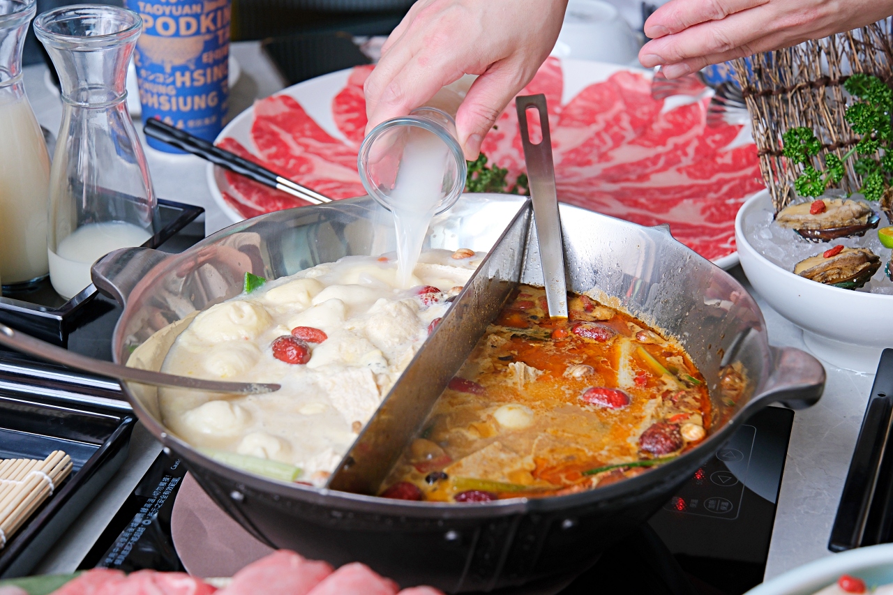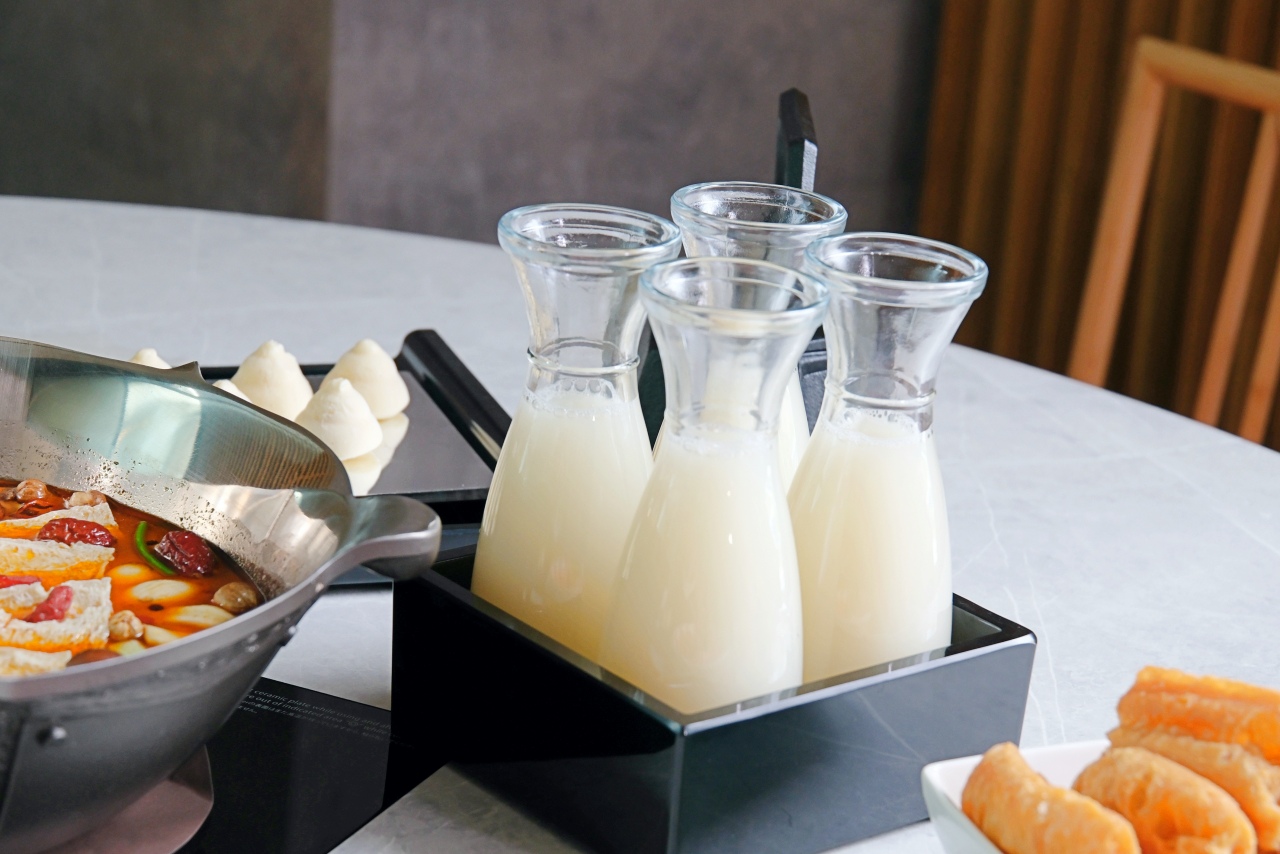 服務人員會在桌邊放一組玻璃瓶裝的乳白色液體,是用來稀釋湯底的高湯,想要吃清爽一點就可以加入適合高湯調整口味喔。