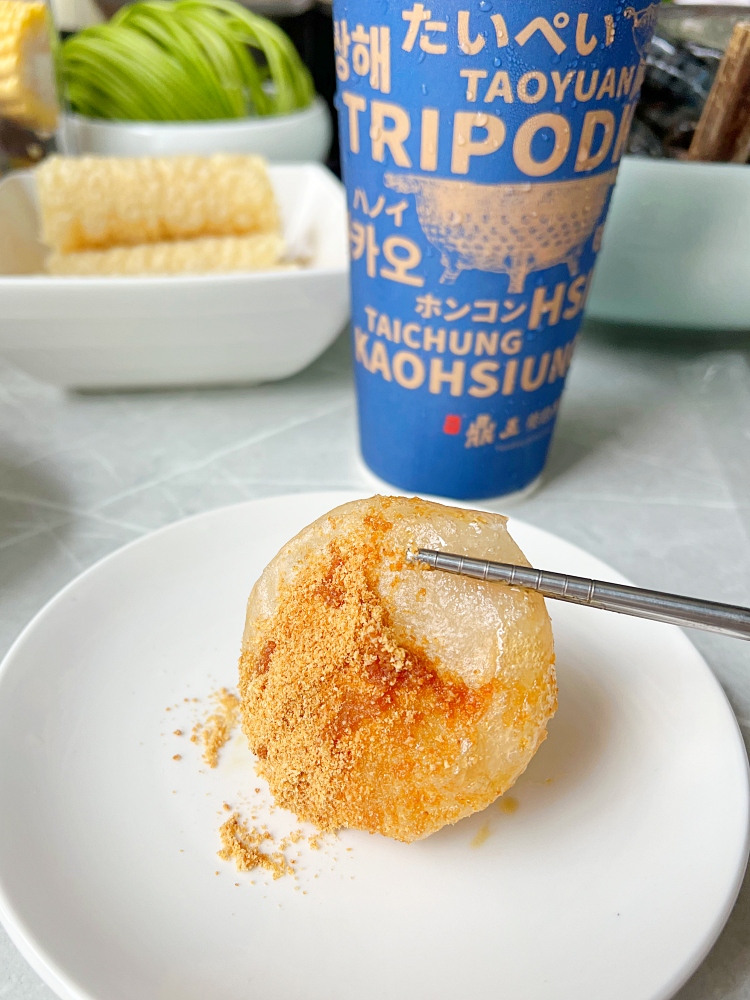 以古早味白糖粿為甜點,吃到中場休息,我們忍不住趕緊請服務人員把白糖粿上桌。炸到外型蓬鬆,撒上花生粉,淋上紅糖漿,一上桌就被我們搶食光了。咬下去外皮很酥脆,裡面是軟嫩的內心,花生香融合紅糖香、糯米香,甜度剛好,太好吃啦。