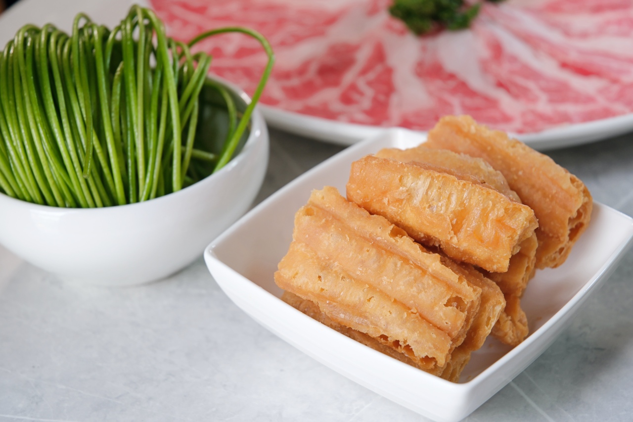 除了肉盤、海鮮之外,吃火鍋常點的青菜拼盤、油條、金鈴捲也可以點起來。把青菜放到白鍋裡面增加湯底鮮甜度,油條、金鈴捲則是很適合放到辣鍋裡面吸收麻辣汁,會超過癮的。
