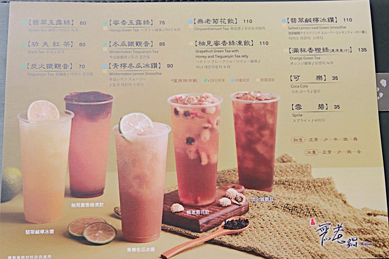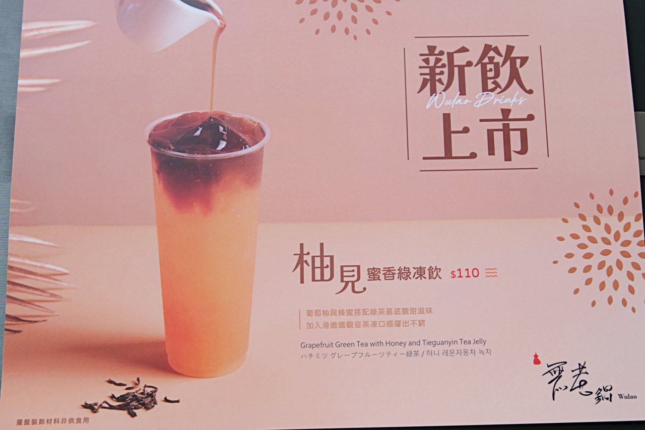 無老鍋台北信義店菜單最大不同的地方就是多了手搖飲的選擇,共有10款獨家風味茶飲,像是冬瓜鐵觀音、青檸冬瓜冰鑽、柚見蜜香綠凍飲、炭火鐵觀音…價格60-110元不等,單一尺寸,就是一般手搖飲料店的大杯。