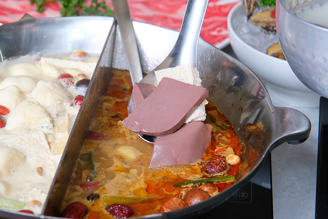 ▲麵包豆腐、薄片鴨血免費無限續加。吸了滿滿麻辣湯汁的軟嫩麵包豆腐,跟麻辣湯底無敵搭!滑嫩薄片鴨血,簡直神隊友,讓麻辣鍋大大加分。
