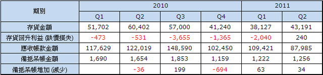 宏碁所公佈的存貨金額,都是扣除備抵存貨跌價損失後的數據,如果當季認列鉅額備抵存貨跌價損失,存貨金額應該會大幅減損,然而 2011 Q2 存貨金額較前一季度增加 50.64 億元,不像是認列鉅額存貨減損後的數據,而且認列存貨跌價損失的高峰期是 2010 Q3 ~ 2011 Q1,實際上 2011 Q2 認列存貨回升利益 2.4 億元。