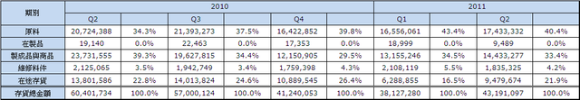 【表二】宏碁 2010 Q2 ~ 2011 Q2 存貨明細 (百萬元)