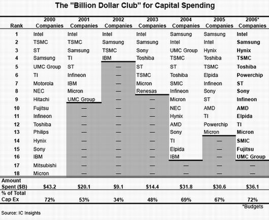 根據市調公司 IC Insight 在 2006 年針對各大半導體廠商資本資出提出預測,估計有十八家公司資本支出金額超過 10 億美元 (詳見【表一】),其中包含三星 (Samsung)、海力士 (Hynix)、力晶、英飛凌 (Infineon)、爾必達 (Elpida)、美光 (Micron) 都是以 DRAM 為主要業務的公司,可見當年 DRAM 產業的盛況。