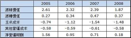 因為能源價格與糧食價格之間的高相關性,能源價格上漲未必會使生質燃料廠商受益,即使酒精價格上漲,玉米價格可能漲得更快,導致生質燃料廠商的利潤減少。根據 2005 ~ 2008 年的經驗,在能源價格持續攀升的同時,玉米價格漲勢更兇猛,壓縮生質燃料廠商的利潤 (詳見【表二】)。