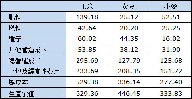 【表一】美國主要農作物生產成本 (美元 / 英畝;節錄自《糧食的價格,誰決定?》)