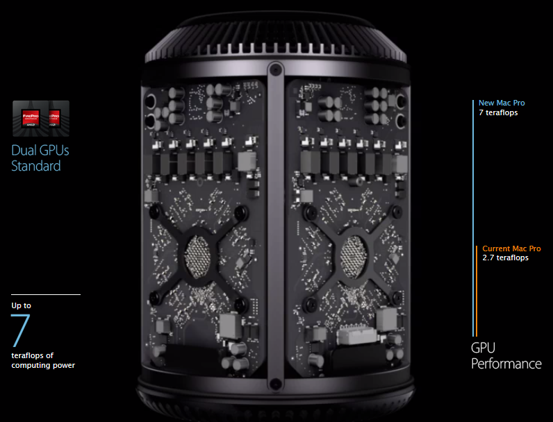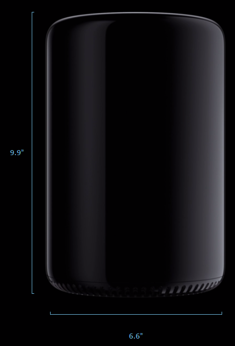 新一代的Mac Pro擺脫前幾代的方形主機,變身為圓筒狀,有點像是鋼鐵人中的反應爐。圍繞在四周的有雙GPU、PCI Express-based flash storage、2代高效Thunderbolt、新一代Xeon處理器、高速記憶體、支援4K播放。