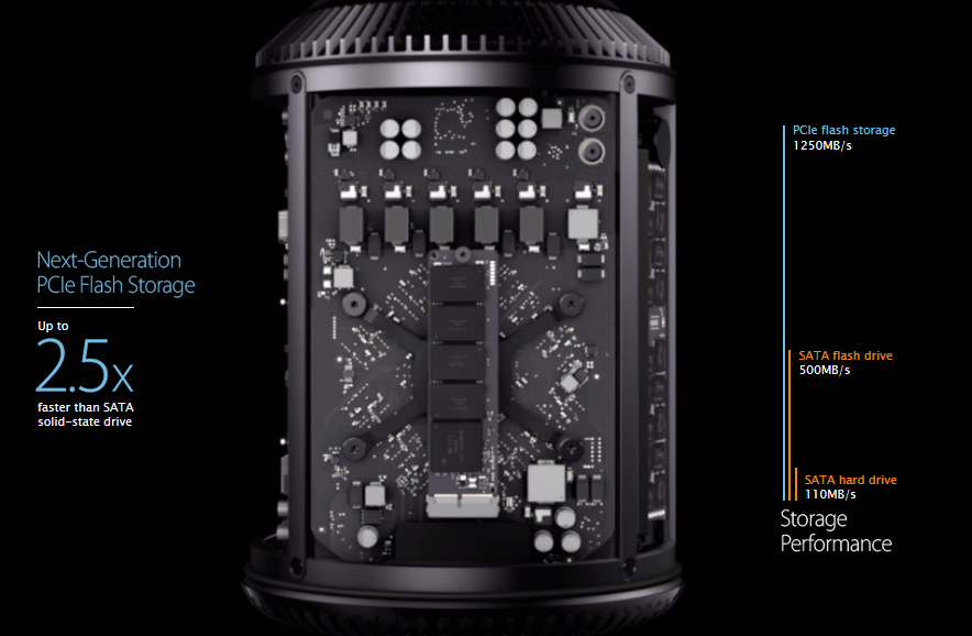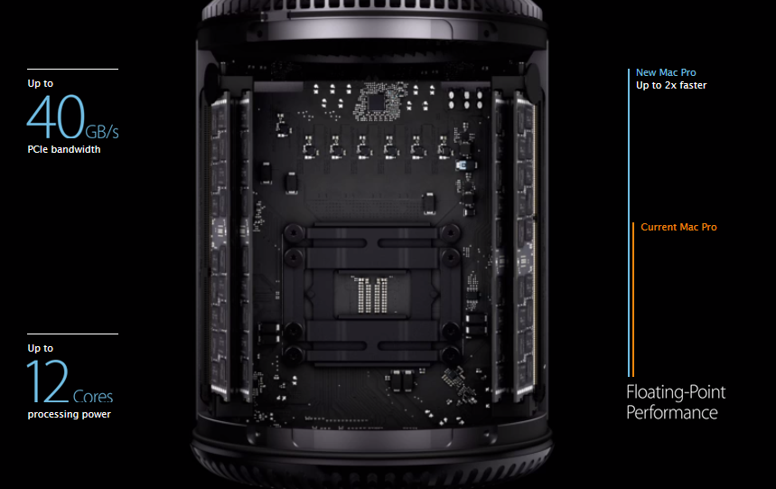 新一代處理器使用Intel Xeon E5 chipset、40GB/ s PCI Express頻寬、比起上一代的Mac Pro處理效能要高兩倍以上。