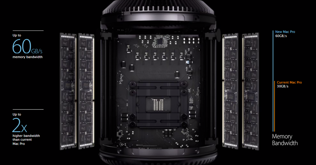 新的Mac Pro對於每個內部組件都進行優化,例如四個可運行1866MHz的DDR3控制器、60GB/s的高頻寬,這表示在運行許多工作時,不會有阻礙。
