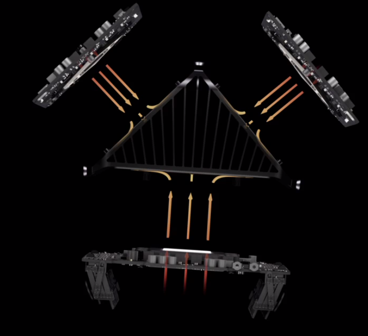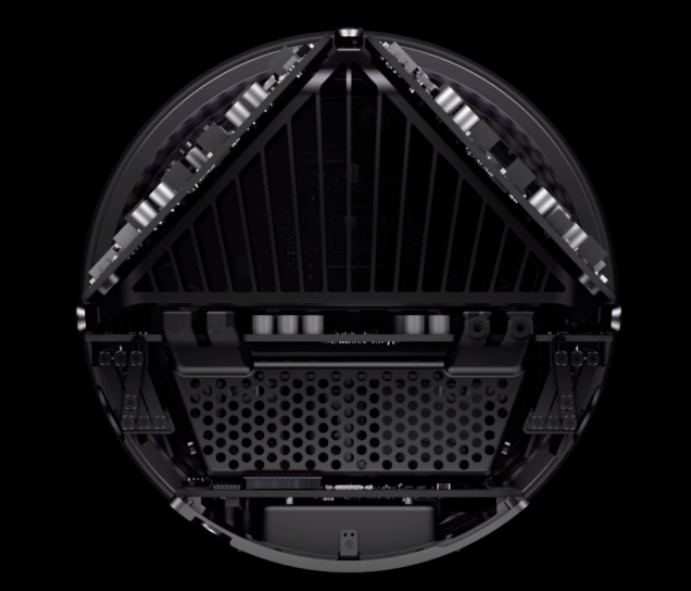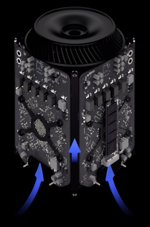 這樣高效能的裝置,散熱也相對重要,新一代Mac Pro並不是使用多個散熱片和風扇進行冷卻,而是使用將熱集中於一個核心,然後只需要使用頂部的風扇,造成對流用以排出熱能,讓機器維持最正常的運作。所以整台機器就只有一個風扇,這設計真的太可怕,也就是最後為什麼會是圓形的原因。