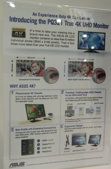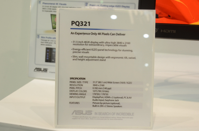 這兩款螢幕都採用 Sharp 的 IGZO 面板,31.5吋的 PQ321近期已經準備要在市場上推出了,價格約為 3,799 美元,台灣要看到可能還要等好一陣子。