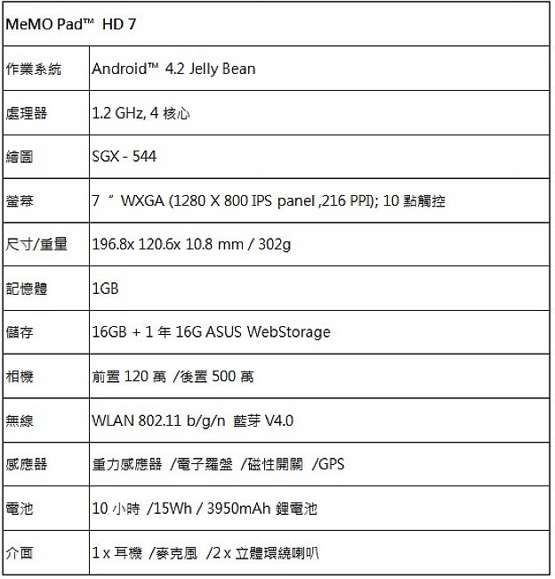 最後分享 ASUS MeMO Pad HD 7 產品規格表給大家。