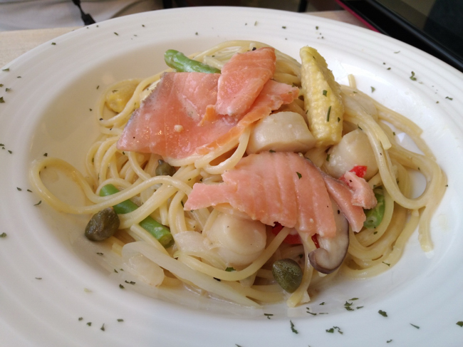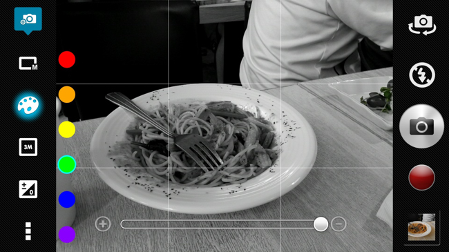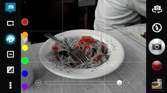 特殊功能部分有個滴管的濾鏡功能還滿有趣的,他會把拍攝物變為灰階後,利用顏色過濾的方式,讓想要顯現出來的顏色出現,可以製造出很有藝術感的效果。例如底下這盤義大利麵在加入顏色前就是黑白照,接下來點下紅色,他就會讓畫面中紅色的甜椒部分顯現出來。