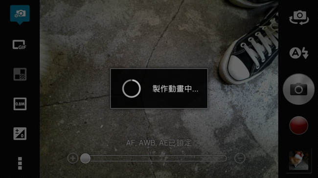 另外在拍照功能中,還有個Gif動畫功能,這功能是利用連拍方式將照片合成為Gif動畫,是很有意思的內建設定。拍攝時要一直按著快門進行連拍,結束拍照後就會開始合成。