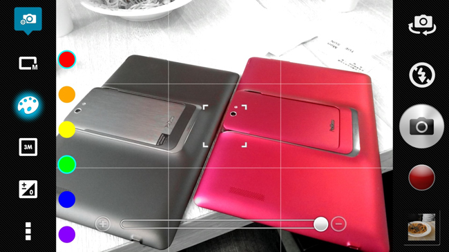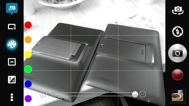 在照片處理前這兩台Padfone Infinity看起來是同樣顏色的,經過處理後讓紅色顯現出來就知道原來一台是桃紅款的。一般來說這都是在電腦上後製才會出現的效果,現在直接在手機上就會出現。
